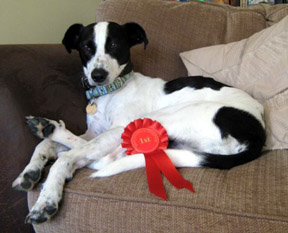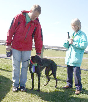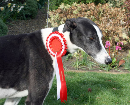 This is Charlie (aka Flurry) he was entered in the Companion Dog competition in the Rescue Dogs class. (He didn't have to do anything, just stand there and look appealing). The judge awarded him first place and commented that it was nice to see a good sized Greyhound for a change!