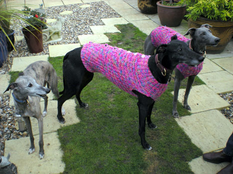 Misty (aka Mitzi) with two of her doggie family looking very smart in our KGC knitted jumpers. |