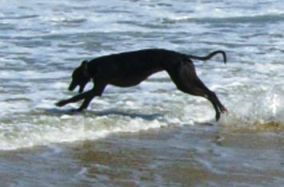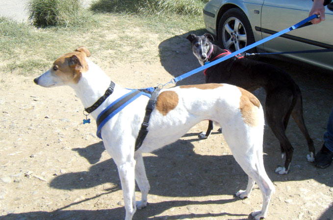 Ruby (aka Leaf) (on right) has been adopted by Claire and Ian of Fakenham. This is Ruby on her first day out to the beach with Jacks (another KGC hound). Ruby has settled in brilliantly and Jacks is very pleased with his new girlie!