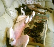 Dave aka Bomber relaxing in his foster home before finding his forever home with Helen and her family in Beccles. |
