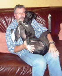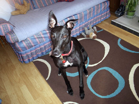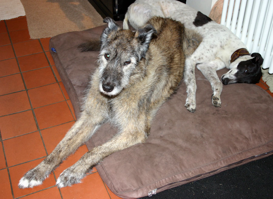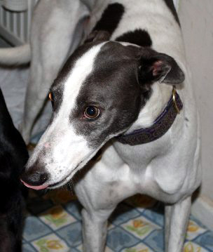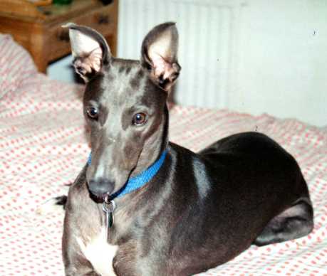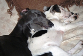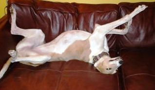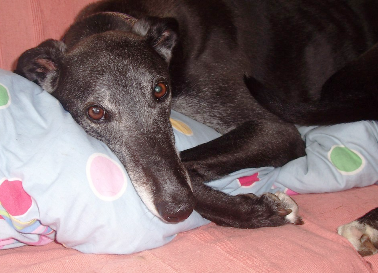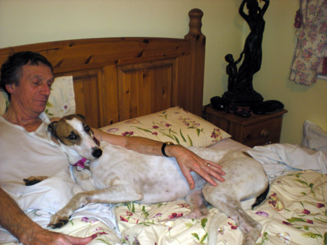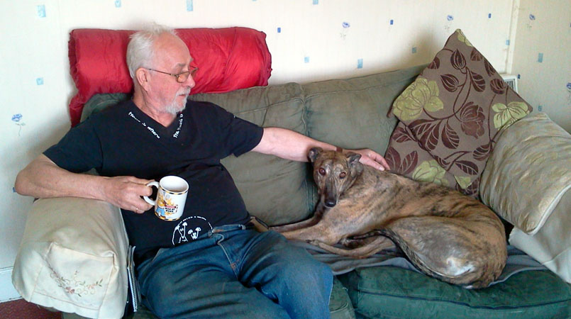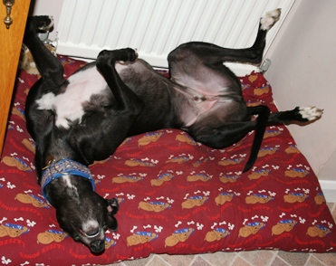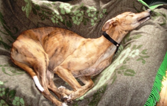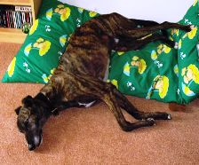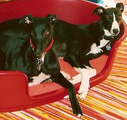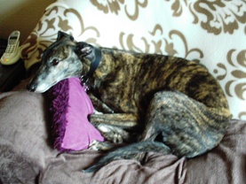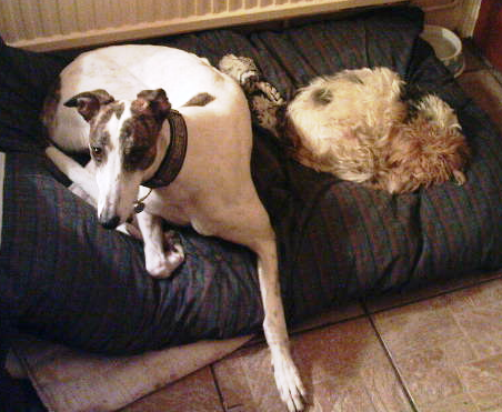 This is a picture of Katie who was adopted during January after being fostered by Sylvia and Dave in Antingham, Norfolk. She shares the settee with Charlie who is also a Kerry Greyhound. She loves to be taken for walks in the country with Charlie and Dave is also allowed to go with them.