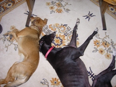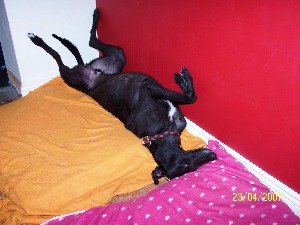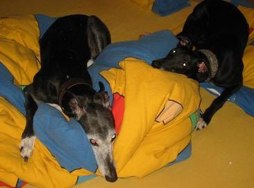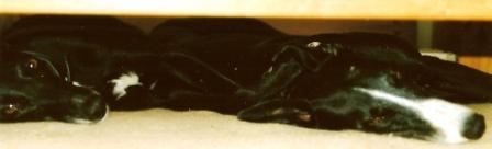 Chocolate and Sasha in their favourite place, a matress under the stairs in the living room |