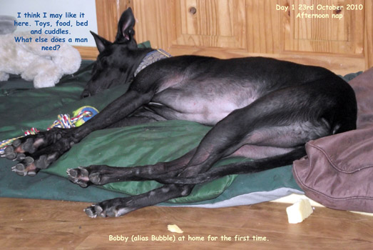 Bubble, now Bobby has been adopted by Sharon and John and lives in Cromer, Norfolk with another KGC hound Manny.
