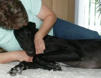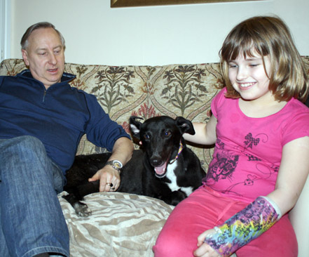Callie adopted by Jan and Al of Sporle having a cuddle with her new dad.