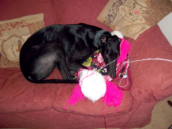 Joe, now called Joey who adopted Stuart and Pip last April, 'helping' with the knitting. |