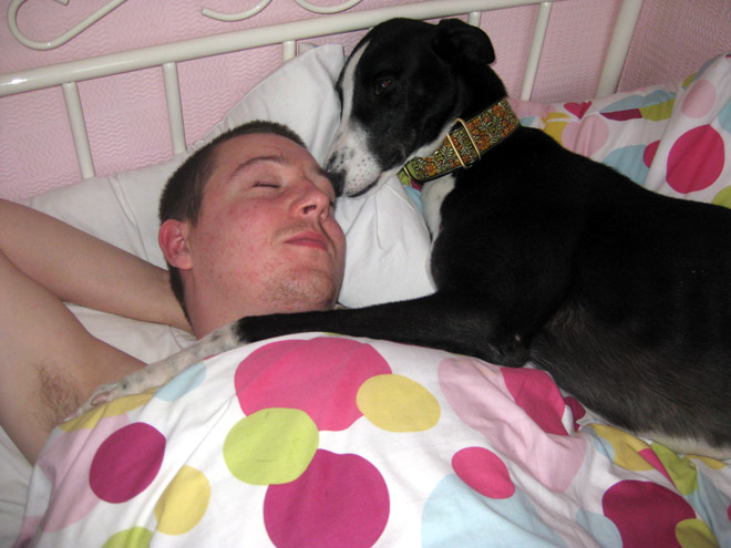 Conor and Mouse have a greyt cuddle on Mike's sofa |